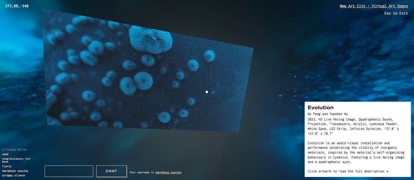 该项目从音流学现象中汲取灵感:微小颗粒会在声音振动环境下自发形成复杂动态图案。 这种无机材料的自主行为引发了我们对生命本质的深刻思考:这些物质的活动与生物体之间的本质区别是什么?我们又该如何将自身存在置于不断演变的宏观和微观背景之中?