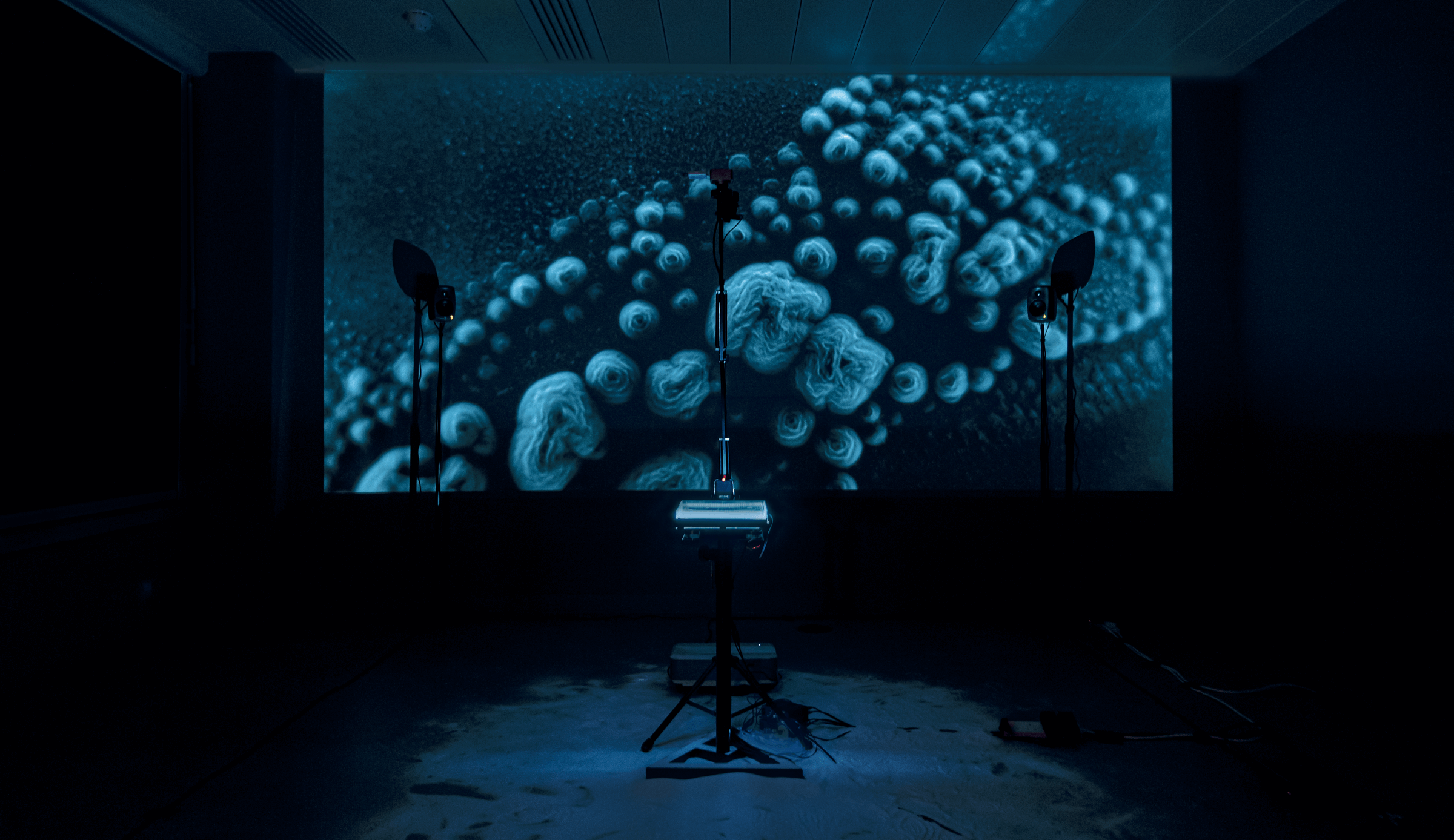 With these questions at its core, Evolution employs a generative system that allows granular substances and the soundscape to evolve in unison, thus freeing matter from its traditionally passive role. The soundscape is composed using generative algorithms that harness the sonic textures collected from the materials, directing the powders to transform. Simultaneously, a live image recognition program interprets particle behaviours to modulate the sound. This ongoing feedback loop fosters a complex and dynamic system, challenging conventional notions of causality and interactivity.