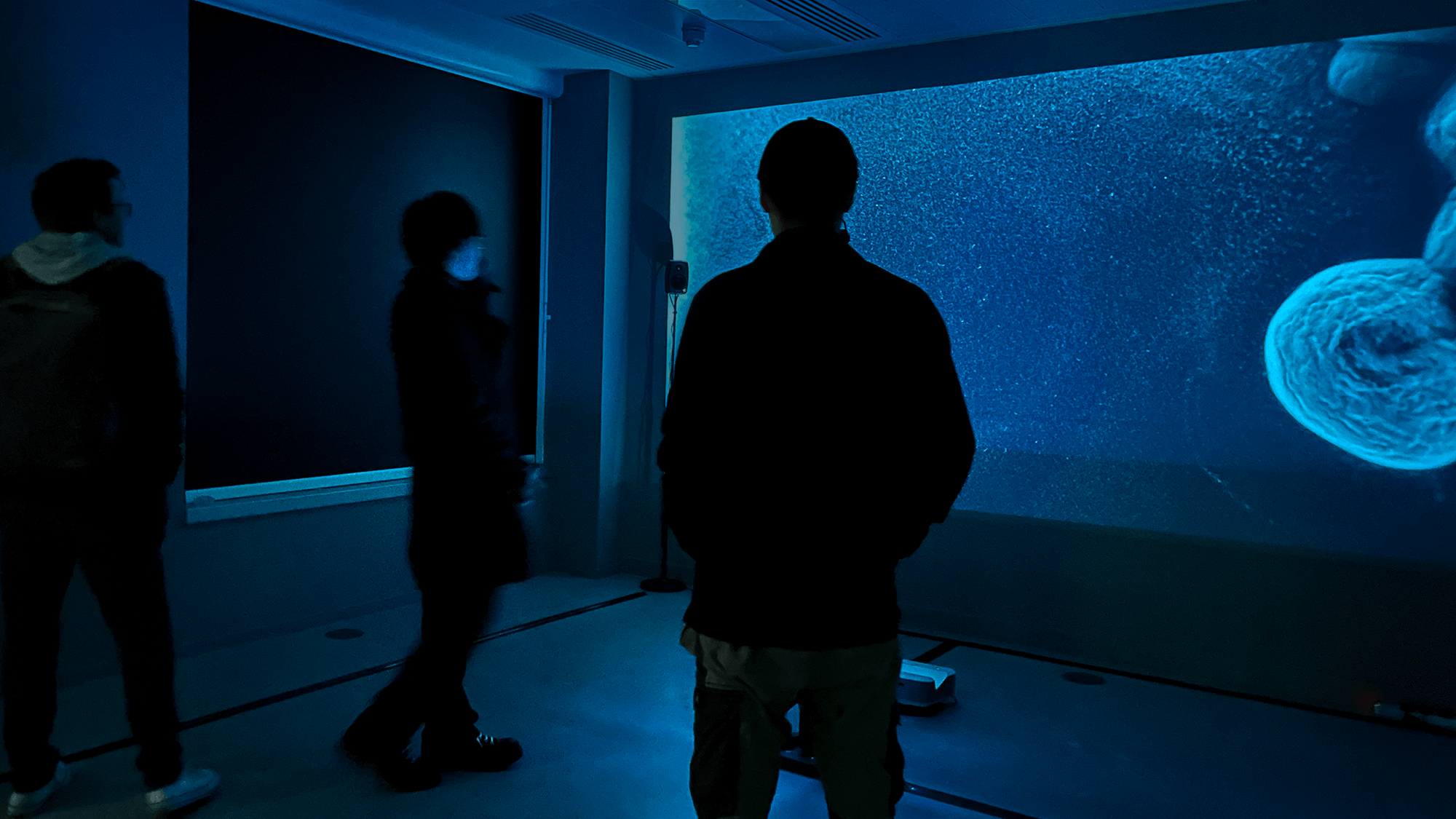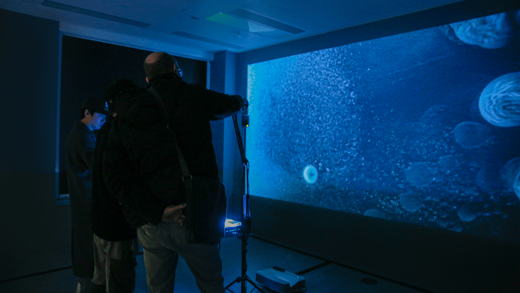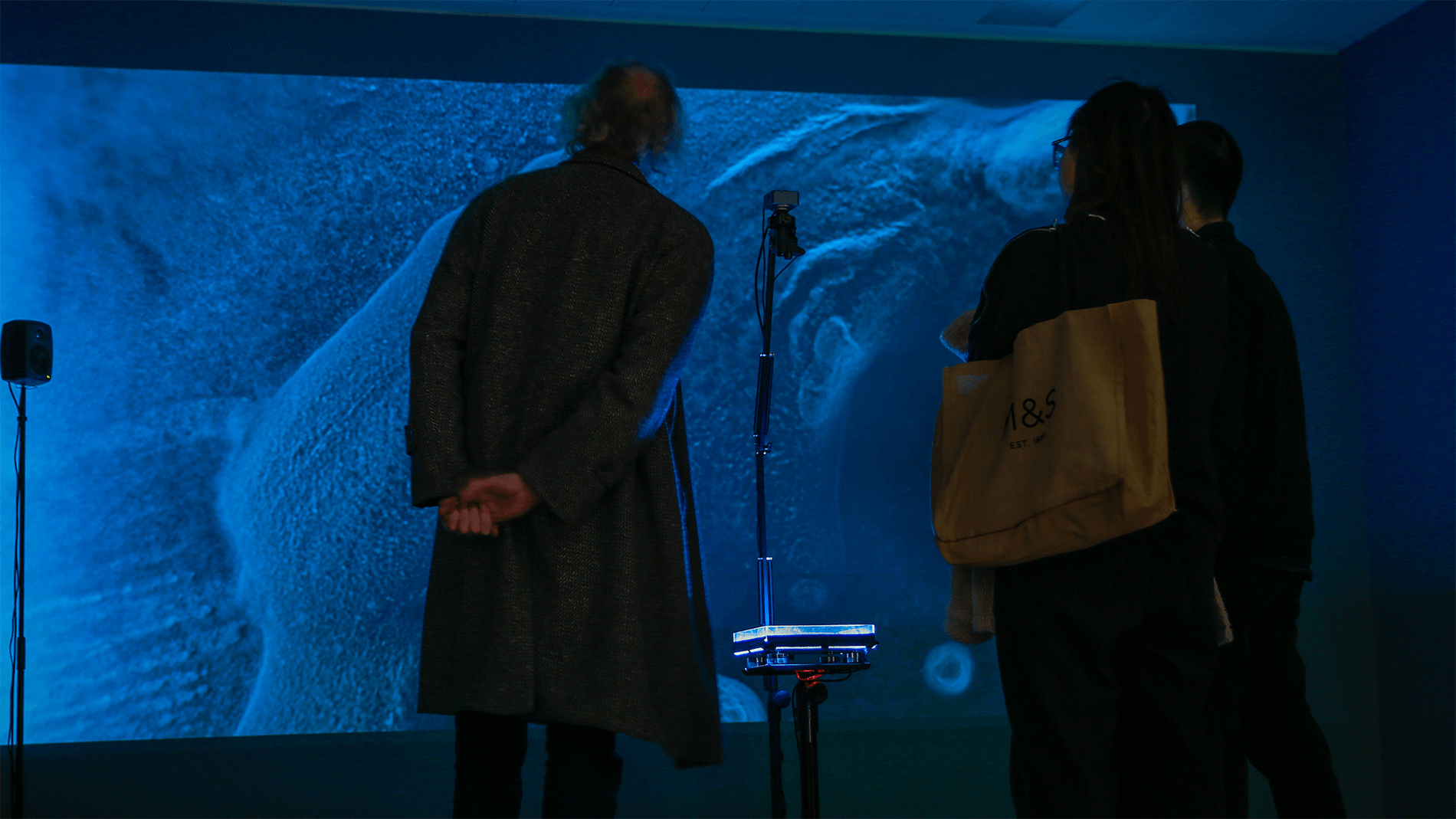 作品由实时投影的显微镜影像和特殊设计的四声道空间声音系统构成,集成了声波振动器与空间音响。同时,观众的互动,比如触摸或在板上绘画,也会实时改变微粒材料的动态以及场域内的声音。在这个由图像、声音和触觉打造的共振场域中,观众将感受微观世界和真实空间的交错,犹如与粉末融为一体,并参与到不同存在的有机对话之中。