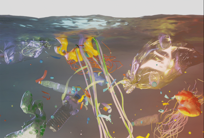 由目前数据预测在2050年,海洋中的塑料垃圾总量将比其中生存的鱼类更多。由此该作品想象了一个推测的世界,塑料垃圾们代替海洋生物,占领了这片领域并热情庆祝起来。
